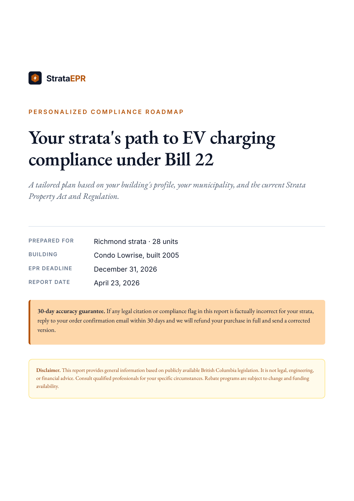 StrataEPR is a compliance tool built for BC strata councils. Answer 8 questions in under 2 minutes and get your EPR status, rebate estimate, and pre-filled legal templates.